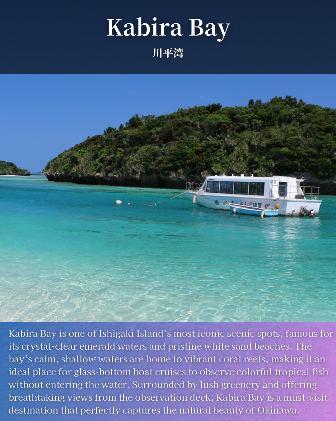 Begin with Kabira Bay, renowned for its emerald-green waters and stunning coastal scenery, where you can fully appreciate one of Okinawa’s most iconic landscapes.