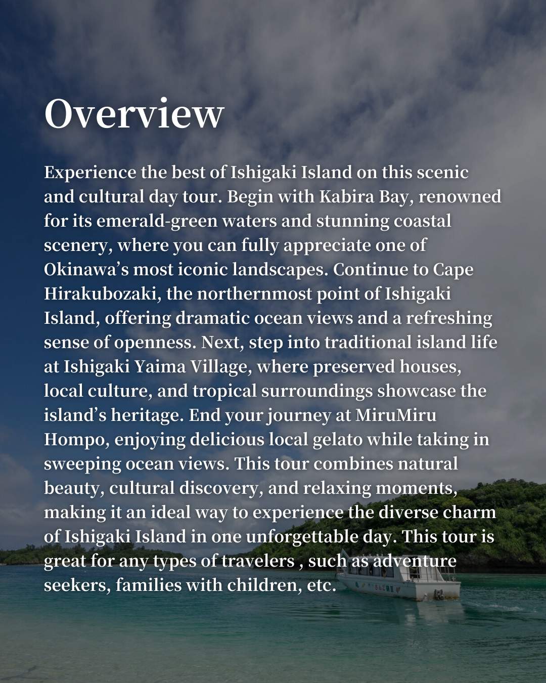 This tour combines natural beauty, cultural discovery, and relaxing moments, making it an ideal way to experience the diverse charm of Ishigaki Island in one unforgettable day.