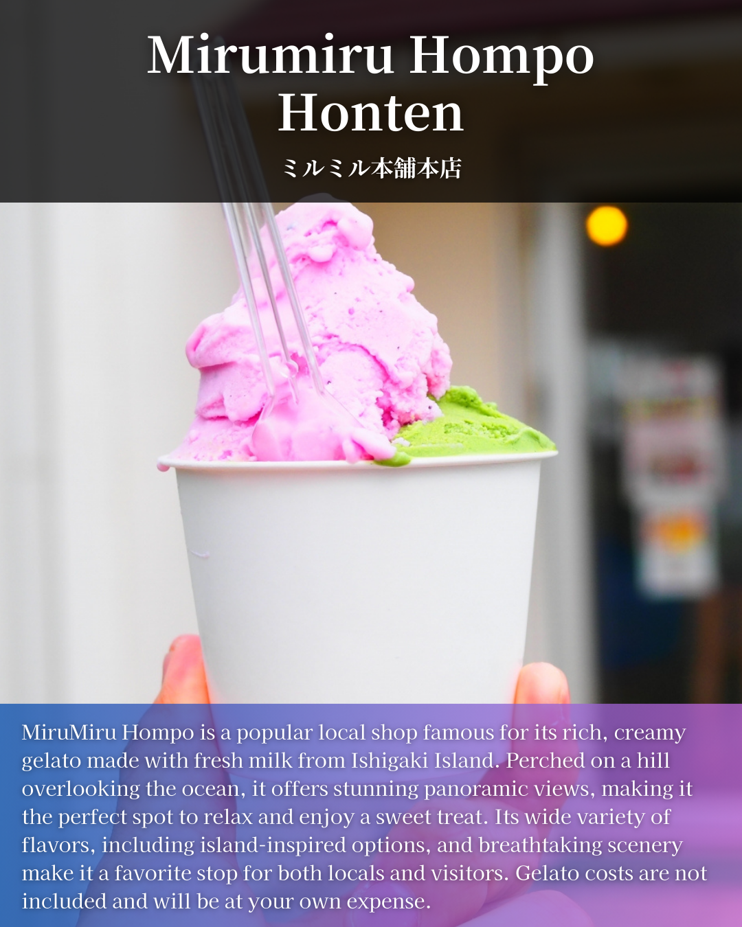 End your journey at MiruMiru Hompo, enjoying delicious local gelato while taking in sweeping ocean views.