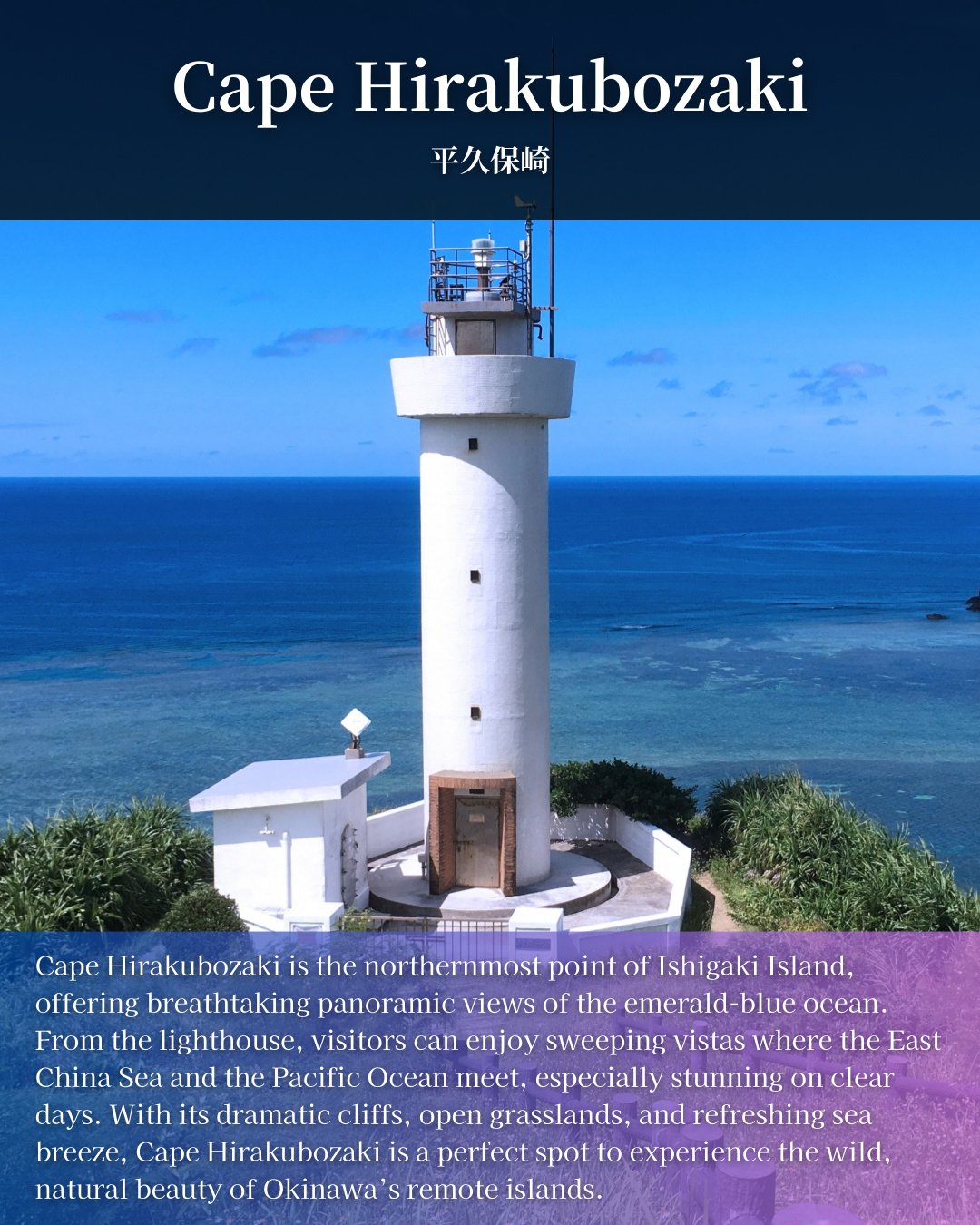 Continue to Cape Hirakubozaki, the northernmost point of Ishigaki Island, offering dramatic ocean views and a refreshing sense of openness.