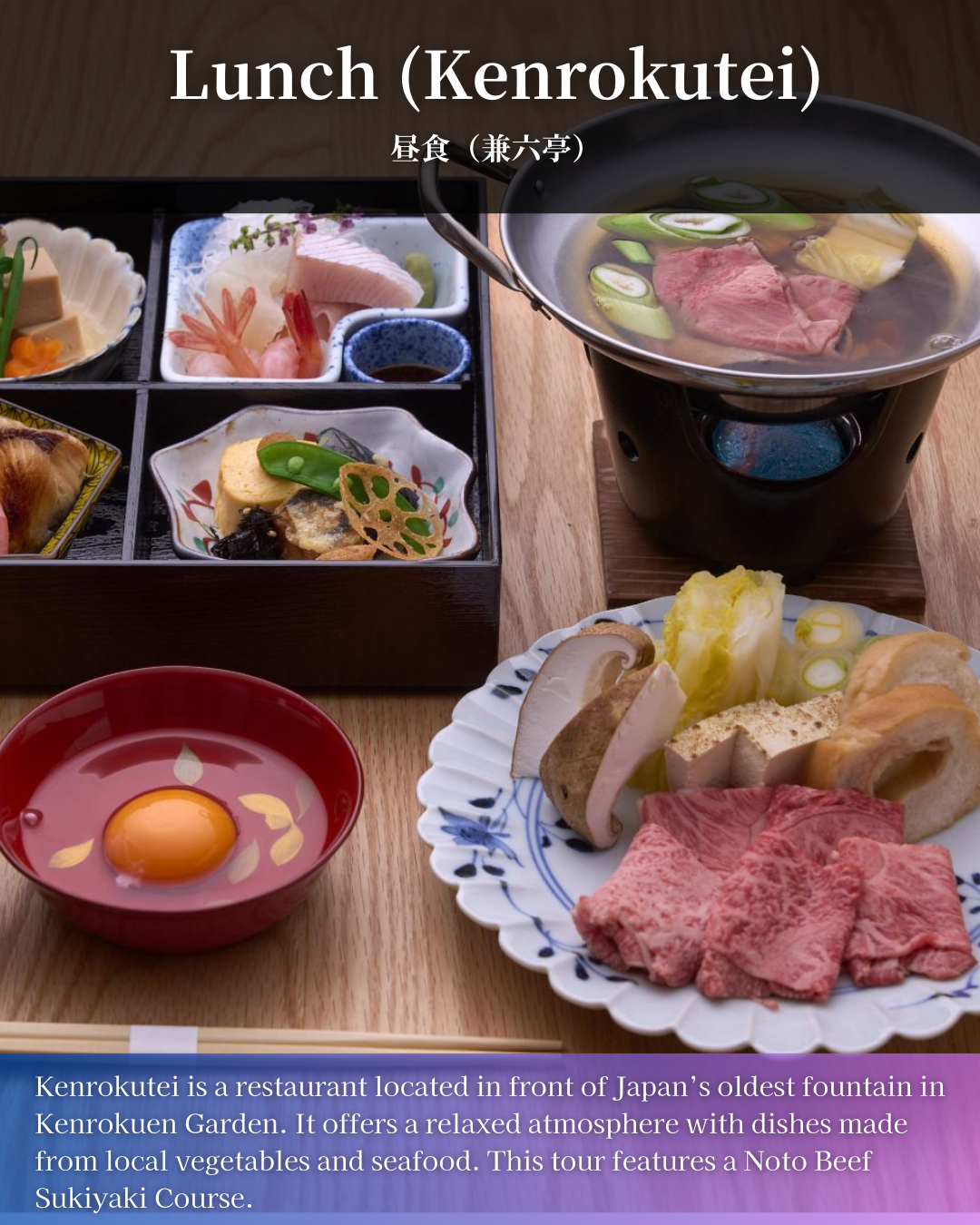 Discover the heart and soul of Kanazawa with a journey that blends nature, craftsmanship, cuisine, and history. Stroll through the breathtaking Kenrokuen Garden. Step into the world of gold leaf at Imai Gold Leaf, meeting artisans who keep this shimmering tradition alive. End your day wandering the charming Higashi Chaya and Kazue-machi Chaya districts, where time seems to slow amid teahouses, narrow lanes, and hidden gems.