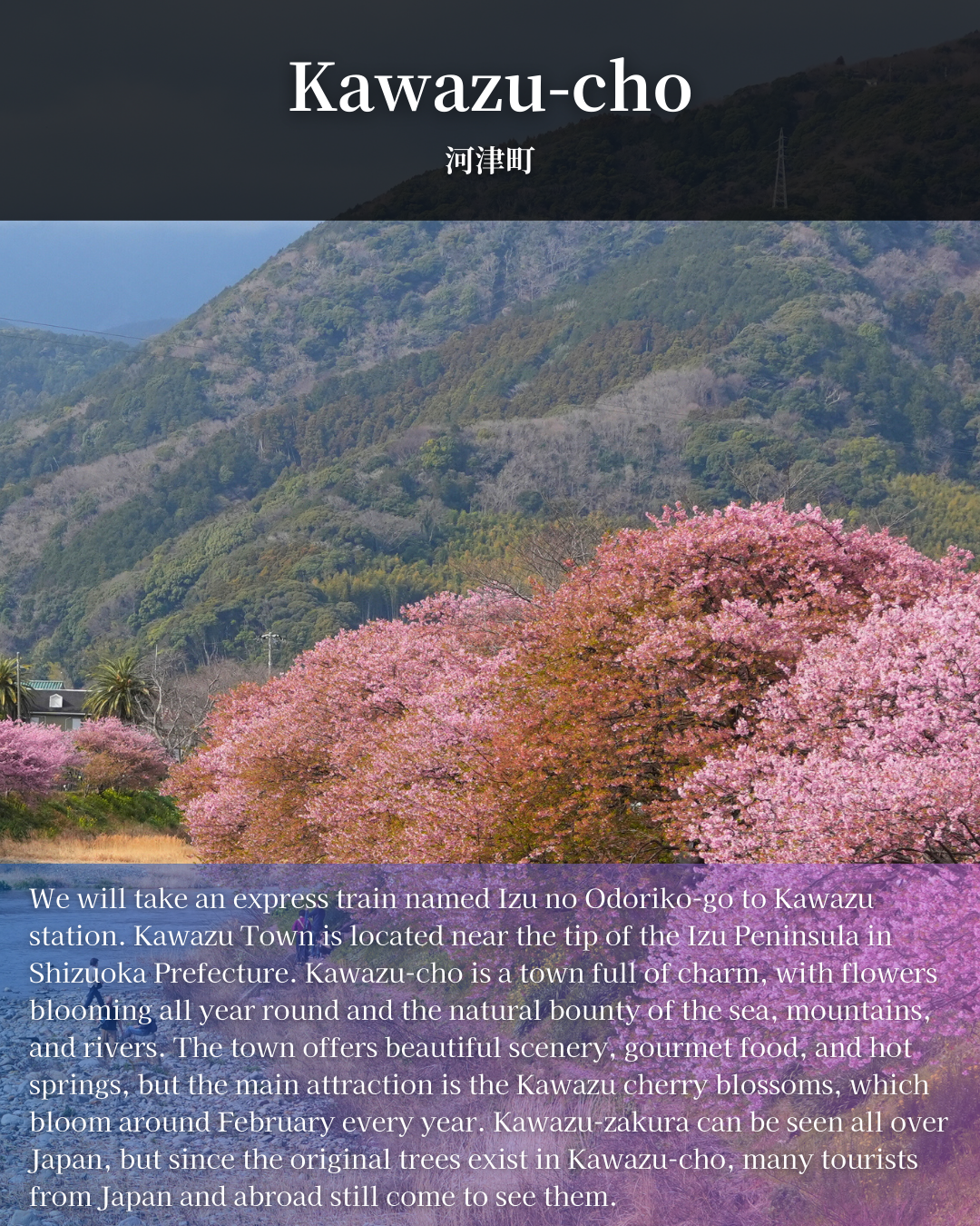 The town offers beautiful scenery, gourmet food, and hot springs, but the main attraction is the Kawazu cherry blossoms, which bloom around February every year.