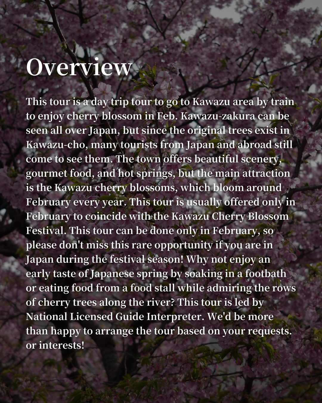 This tour is usually offered only in February to coincide with the Kawazu Cherry Blossom Festival.