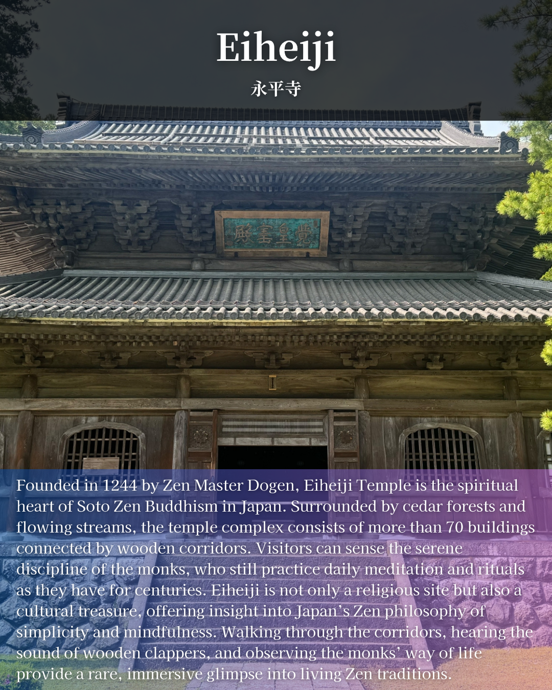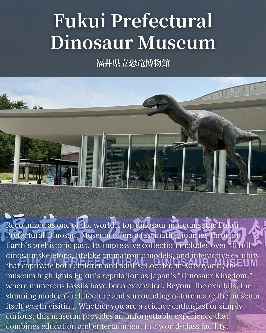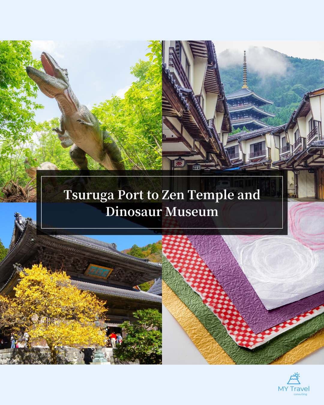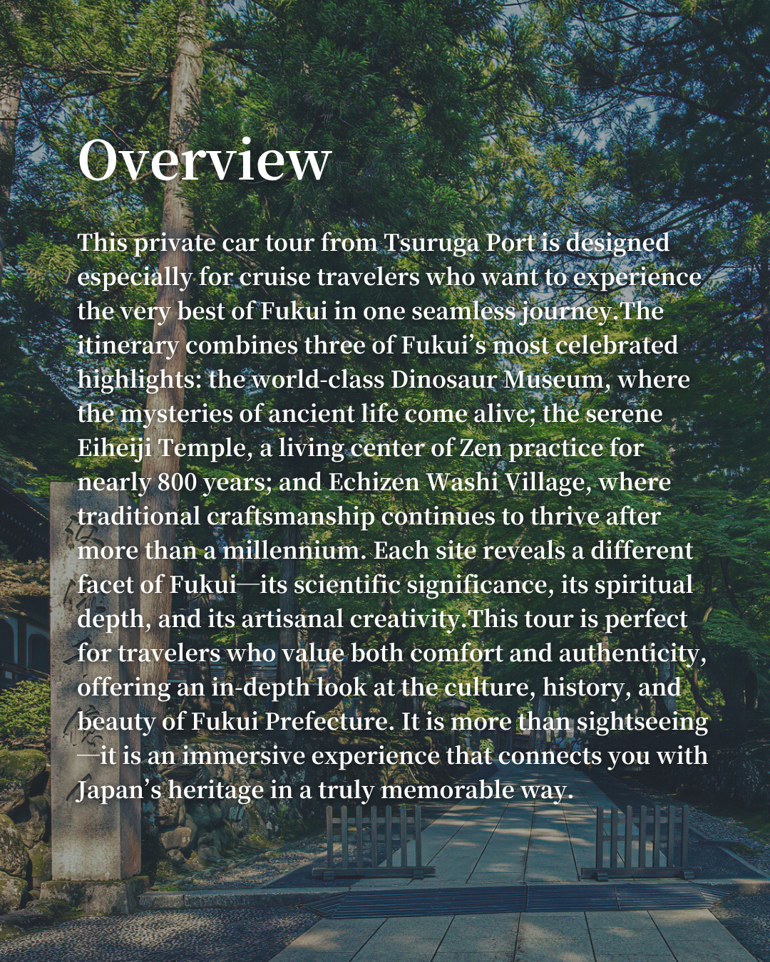This private car tour from Tsuruga Port is designed especially for cruise travelers who want to experience the very best of Fukui in one seamless journey.The itinerary combines three of Fukui’s most celebrated highlights: the world-class Dinosaur Museum, where the mysteries of ancient life come alive; the serene Eiheiji Temple, a living center of Zen practice for nearly 800 years; and Echizen Washi Village, where traditional craftsmanship continues to thrive after more than a millennium. Each site reveals a different facet of Fukui—its scientific significance, its spiritual depth, and its artisanal creativity.This tour is perfect for travelers who value both comfort and authenticity, offering an in-depth look at the culture, history, and beauty of Fukui Prefecture. It is more than sightseeing—it is an immersive experience that connects you with Japan’s heritage in a truly memorable way.
